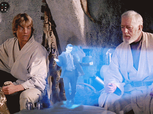 Luke Skywalker and Obi-Wan Kenobi watch a holographic projection of Chandler from Friends dancing.