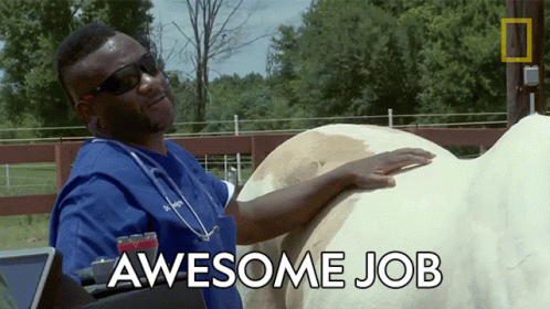 Dr. Hodges, a veterinarian, gives a horse a pat on the back, with 'AWESOME JOB' text on screen.
