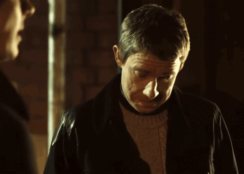 Martin Freeman as John Watson shares an awkward, embarrassed laugh, looking down and then smiling.