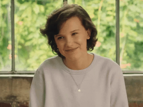 Millie Bobby Brown makes an awkward and disgusted face while wearing a light-colored sweatshirt.