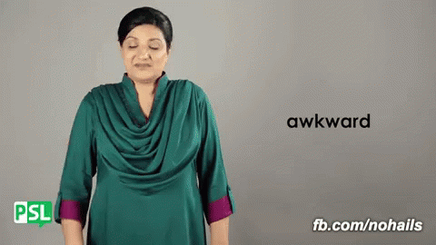 A woman demonstrates the sign for 'awkward' in Pakistan Sign Language (PSL).