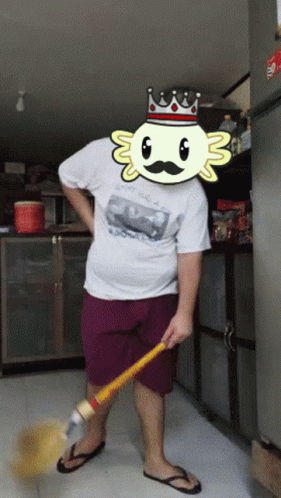 A person with an Axolittles mask sweeps the floor in a home setting.