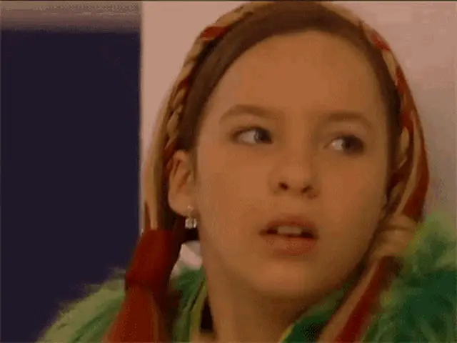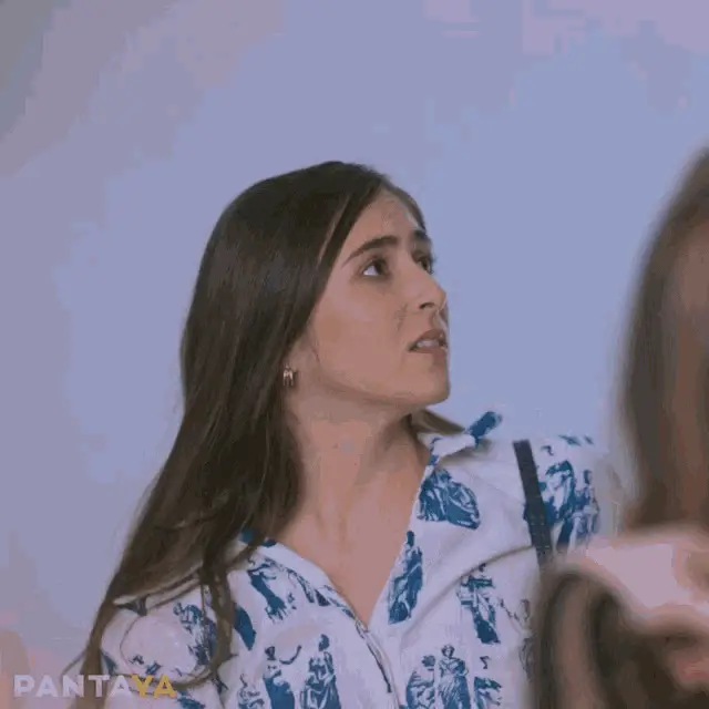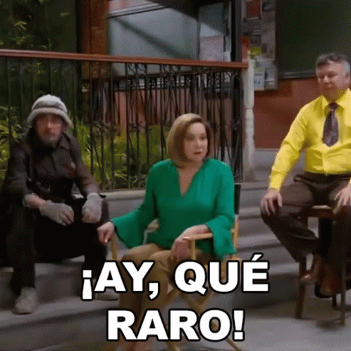 Ana Bertha Espín as Lorena reacts with '¡Ay, qué raro!' while sitting with two men, a moment from the show Vecinos.