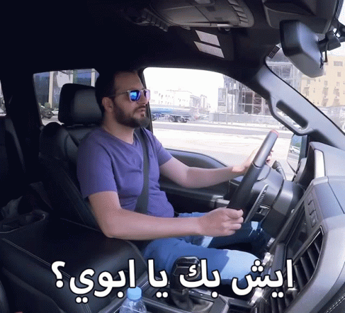 Man driving a car with an Arabic caption asking 'What's wrong with you, my father/bro?'.