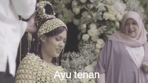 A beautiful Javanese bride, Ayu, is showered during a traditional Indonesian wedding ceremony, looking 'ayu tenan' (really beautiful).