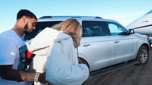 Anuel Aa helps Karol G near a private jet and a silver SUV, as they prepare for travel.