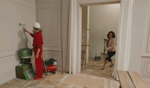 Ayuso appears with a shovel in a room being painted, looking determined during a renovation.