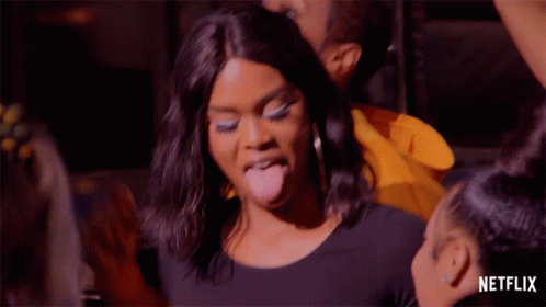 An excited woman from Netflix's Rhythm And Flow dancing energetically with her tongue out in a lively crowd.