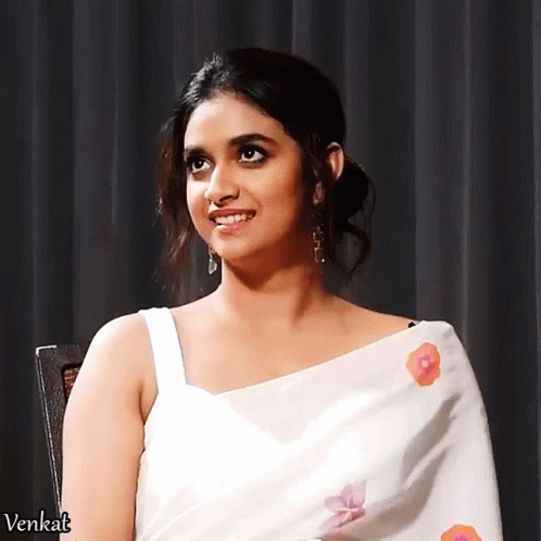 Keerthy Suresh in a white saree, showing a range of expressive and cute reactions, including smiles and puzzled looks.