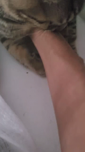 Watch Az Azzy, a tabby cat, playfully bite a finger while being gently petted on the nose.