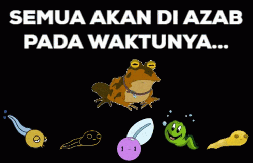 A cartoon frog surrounded by various tadpoles, with the Indonesian text 'Everyone will be punished in due time'.