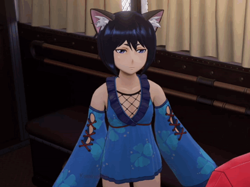Azami Mochizuki, the cat-eared ninja from Sakura Wars, raises her arms in a blue dress.