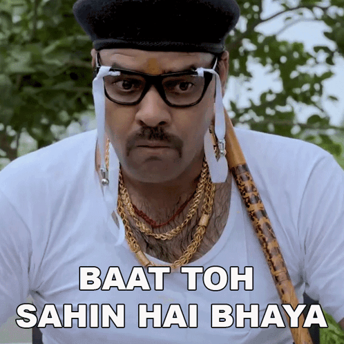 Balraj, a man with glasses and a mustache, points at the camera with the phrase 'Baat Toh Sahin Hai Bhaya'.