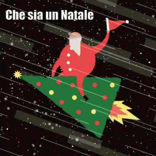 Santa Claus flies through space on a Christmas tree rocket, wishing everyone a 'Space Christmas'.