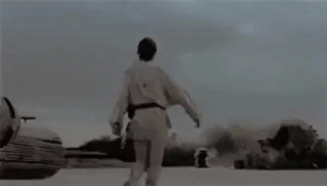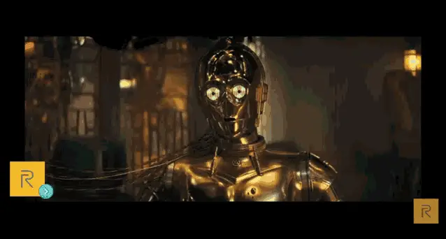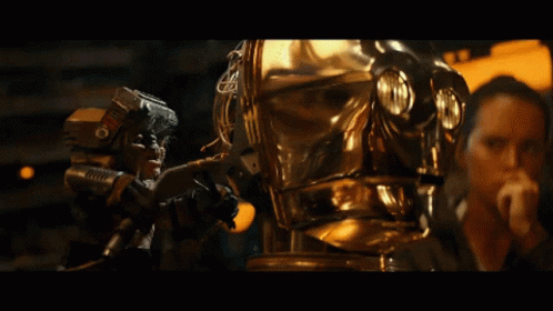 Babu Frik works on C-3PO's head while Rey watches in the Star Wars universe.