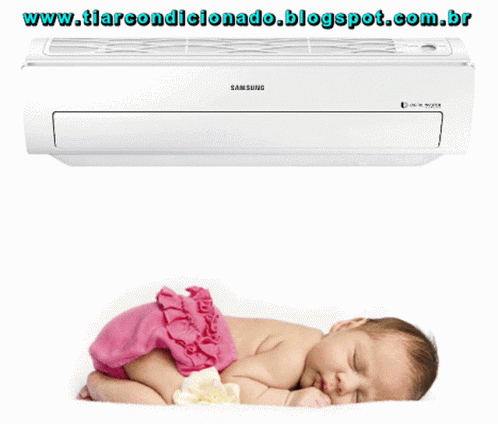 A baby sleeps peacefully next to a Samsung Digital Inverter air conditioner, suggesting comfort and coolness.