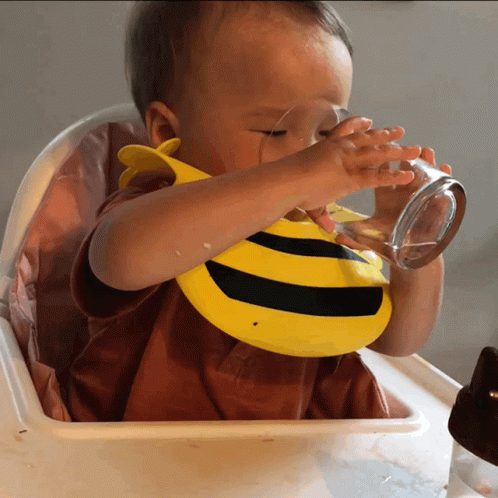 Cute baby in a bee bib drinks from a glass and makes a hilariously disgusted face.