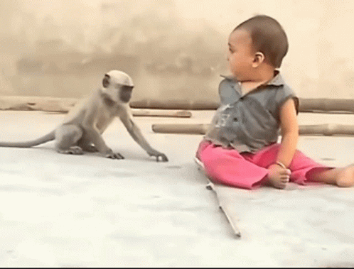 A baby cries while a monkey gently touches its arm, then the baby turns away and cries again.