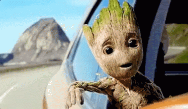 Baby Groot enjoys a car ride, looking out the window with the caption '#partiu' (let's go) for a fun trip.