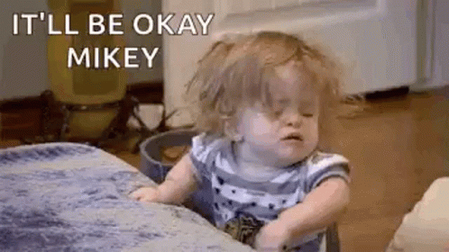 A lazy baby named Mikey is comforted with the phrase 'It'll be okay Mikey' while looking sleepy.