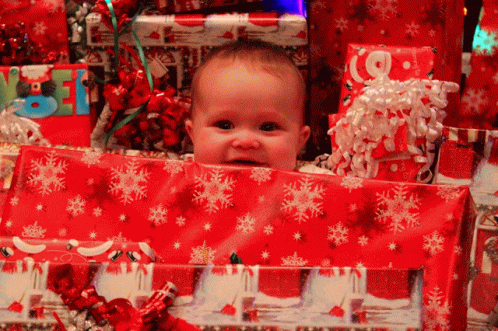 Adorable baby peeking out from a huge pile of festive red Christmas presents, surrounded by holiday cheer.