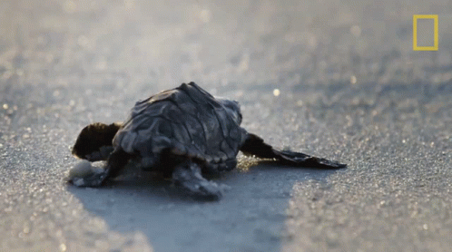 A baby sea turtle hatchling crawls across the sand towards the ocean on World Turtle Day.