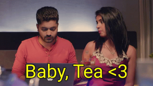 A woman offers tea to a man working on his laptop, with the affectionate caption 'Baby, Tea <3'.