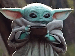 Baby Yoda (Grogu) sips from a small cup, enjoying a drink.