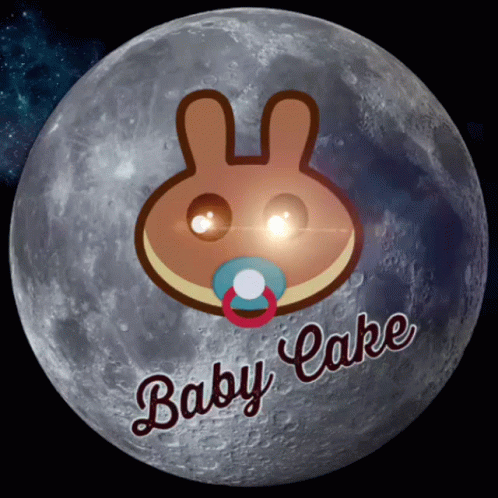 Animated Babycake logo with a pacifier and glowing eyes, set against a full moon background.