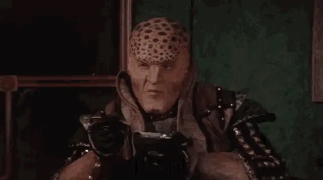 G'Kar from Babylon 5, an alien with spotted skin, declares 'THIS IS A GREAT DAY!' with a smile.