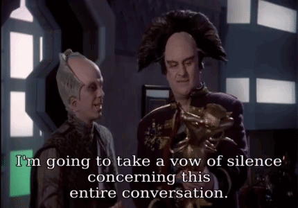 Londo Mollari and Lennier from Babylon 5, with Londo declaring a vow of silence.