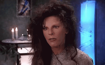 Mira Furlan as Delenn in Babylon 5, expressing intense anger with wild hair and sharp teeth.