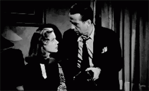Lauren Bacall and Humphrey Bogart share an intimate moment in a classic black and white film scene.
