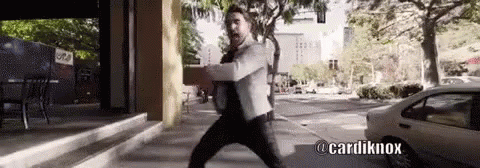 Cardiknox performs a smooth backward steps dance on a city sidewalk, showcasing impressive moves in bright red shoes.