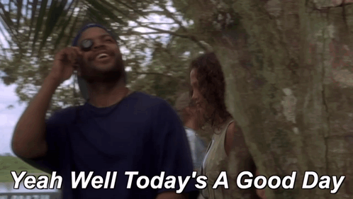 a man talking on a cell phone with the words yeah well today 's a good day above him