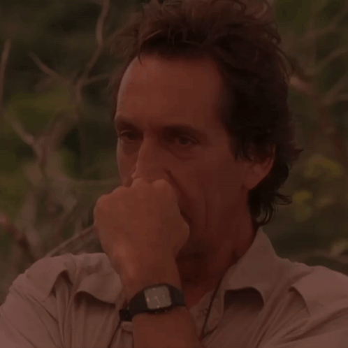 Man wearing a square watch covers his nose, appearing scared or nervous, likely reacting to a movie.