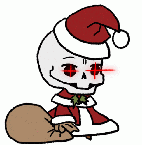 Badbrix Padoru, a skeleton character wearing a Santa hat, spins around with a bag of presents.