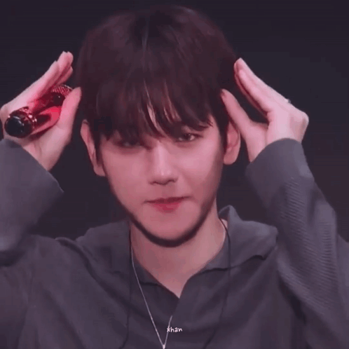 Baekhyun from EXO flashes an adorable puppy smile while playfully adjusting his hair at a fan meet.