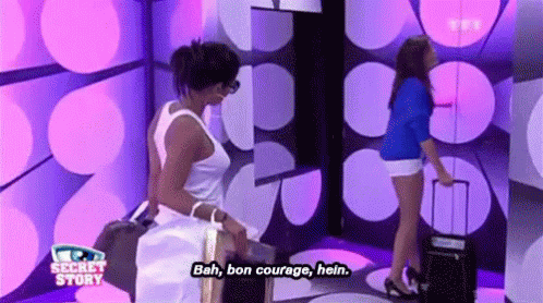 Two women in a purple room, one says 'Bah, bon courage, hein' while pulling luggage.