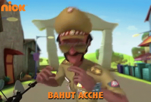 Inspector Chingum from Nick India animated series, with 'Bahut Acche' caption and a hand gesture.