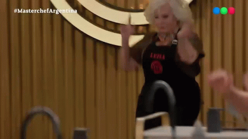 Luisa Albinoni joyfully dancing on the set of Masterchef Argentina, wearing her black apron.