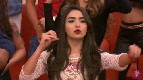 A young woman with long dark hair and a white lace top dances energetically in a studio setting for the show Enamorandonos.
