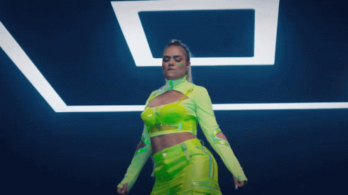 Karol G dancing in a neon green outfit against a dark, futuristic background with glowing white lines.
