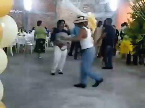 People dancing at a lively party, including a man in a hat.