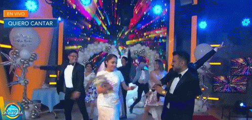 Mariano and his bride perform a lively wedding dance on stage during the 'Venga La Alegría' show, celebrating their special day.