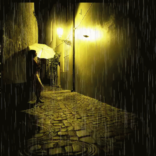 A woman with an umbrella stands in a dimly lit, cobblestone alley during a heavy rain at night.