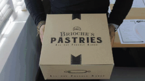 Unboxing a box filled with delicious bakery brioche and other freshly baked pastries, some with chocolate and white icing.