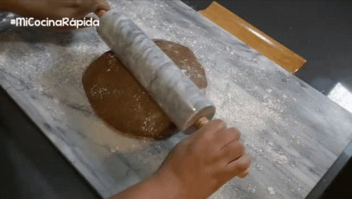 A person uses a rolling pin to flatten chocolate dough on a floured surface, preparing it for baking.