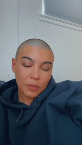 Woman with a recently shaved head wearing a blue hoodie, speaking to the camera.