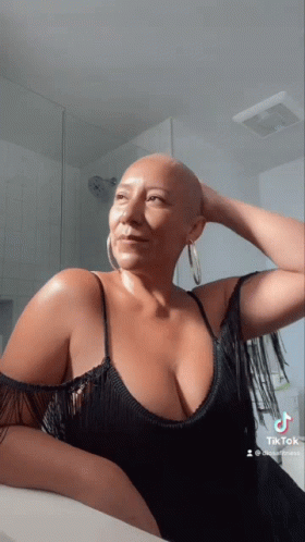 A bald woman with large hoop earrings and a black fringed top confidently poses, touching her head and neck.